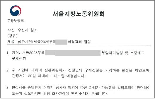 이에 서울지방노동위원회는 저희 주장을 받아들여 ‘기각’ 판정을 내렸습니다.